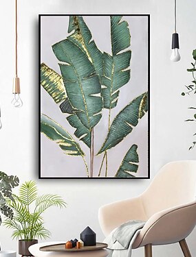 Peinture à l'huile faite à la main toile art mural décoration plantes de fleurs modernes avec des feuilles de bananier bordées d'or pour la décoration intérieure roulé sans cadre peinture non étirée