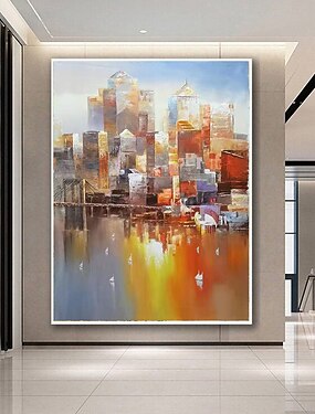 Grande peinture à l'huile abstraite, réalisée à la main, représentant un paysage urbain abstrait. Peinture texturée et colorée, art mural original représentant une promenade en ville. Décoration haut