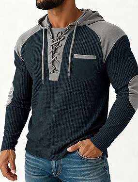 Homme T-shirt gaufré T-shirt Henley gaufré Chemises pour hommes avec coudières manche longue À capuche Automne Printemps & Automne Couleur Unie Mode Moderne Cordon de serrage Poches Patchwork