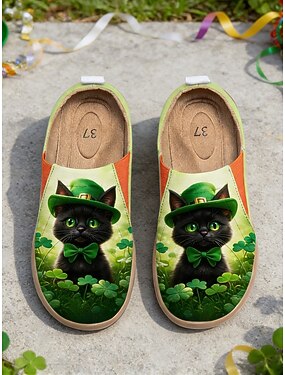 Baskets slip-on pour femmes, motif chat noir et trèfle, idéales pour la Saint-Patrick : chaussures respirantes, légères et confortables pour la parade irlandaise, les festivals et les fêtes de rue.