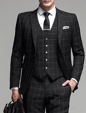 Pour des hommes Costumes d'affaires Occasionnel Semi-Formel Noir Printemps Costume / Tailleur Revers Cranté Formel Plaid Coupe Slim 3 pièces Simple boutonnage un bouton
