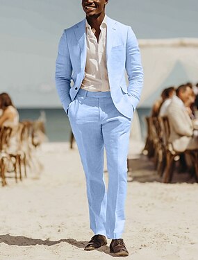 Pour des hommes Costumes en lin Mariage à la plage Occasionnel Bleu Ciel Vert Sauge Printemps, Automne, Hiver, Été Costume / Tailleur Revers Cranté Mode Quotidien Couleur Unie Coupe Standard 2 pièces