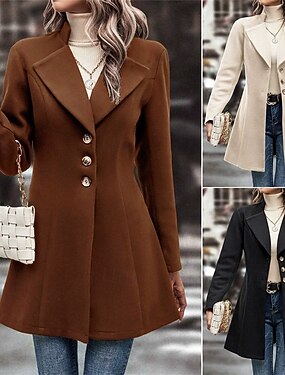 Femmes Manteau Trench Chaud Confortable Avec Poches Mode Moderne Occasionnel Uni Sortir Week-end Simple Boutonnage Long Col Rabattu Coupe régulière manche longue Vêtements d'extérieur Noir Blanche