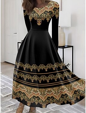 Femmes Robe maxi Robe trapèze Robe ajustée et évasée Vacances Occasionnel Boho Quotidien Soirée Sortir Coupe régulière Graphique Tribal manche longue Col ras du cou Bleu Jaune Violet Vert Ét
