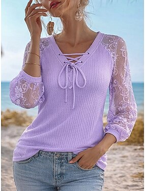 Femmes T-shirt Dentelle Imprimé Fleuri Graphique Plantes Élégant Classique Moderne manche longue Col en V Hauts Réguliers Quotidien Sortir Bleu Violet Fuchsia Vert Été Printemps