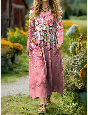 Robe Maxi Boho Femme Robe d'Été Robe A Lignes Vacances Décontractée Anniversaire Quotidien Fête Ajustement Lâche Floral Manches Longues Col V Marine Marron Clair Bleu Violet Printemps Automne