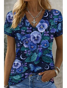 T-shirt femme à imprimé floral, style vintage, manches courtes, col V, coupe classique, manches courtes, col V, idéal pour le sport et les sorties, violet, été, printemps, automne, hiver