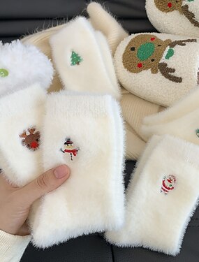chaussettes d'hiver de Noël pour femmes, chaussettes épaisses et chaudes avec bonhomme de neige &Motif Père Noël, chaussettes de vacances douillettes en peluche de vison blanc, chaussettes de nuit