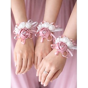 Bracelet de fleurs en ruban de polyester avec perles d'imitation, disponible en plusieurs couleurs. Accessoire élégant pour les demoiselles d'honneur et les mariées lors de mariages, bals de fin d'année et autres événements formels.