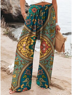 Femmes Jambe large Pantalons Vacances ancien Style Ethnique Longueur complète Taille haute Fleuri Avec Poches Ceinture Élastique Imprimé Confortable Respirabilité Non Elastique Occasionnel Quotidien