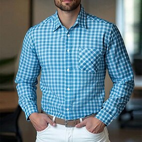 Homme Chemise Chemise habillée Chemise Boutonnée Plaid Mariage Quotidien bleu marine Bleu Gris Claire manche longue Col Rabattu Printemps Automne Vêtement Tenue Poche Avant