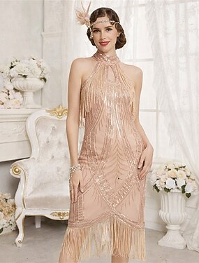 Années Folles Années 1920 Midi Robe Soirée de mariage enterrement de vie de garçon Sans manches Gatsby le Magnifique Charleston Invité au mariage Paillettes Frange à pompons Col Halter Déguisement