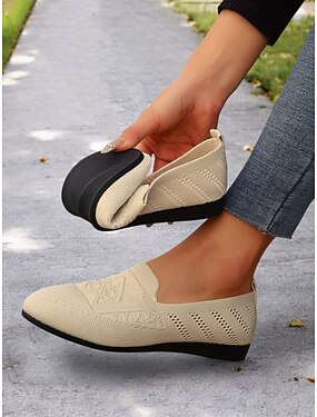 Chaussures de marche Flyknit beiges légères pour femmes avec semelle ergonomique souple, confort respirant pour les déplacements, le jogging au parc et les courses quotidiennes
