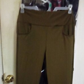 Jaime vraiment ce pantalon. Je mesure 5 pieds 2 ", je pèse 140 livres, taille L, ils sont un peu longs mais pas assez pour vraiment avoir de limportance. Cette couleur est une couleur cuivrée pour moi, je nai jamais eu cette couleur de pantalon auparavant mais jadore cette couleur. Ils sont doux et confortables à porter , et jaime quils soient taille haute. Je les aime tellement que jen ai acheté 3 paires.