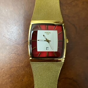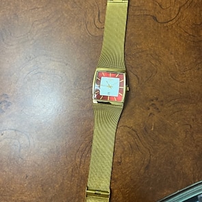 The watch is nice for the price I paid. The band is a nice gold, not too shiny. It is simple and elegant The red on the inside of the face will go with my red shirts.