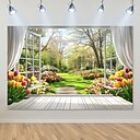 Tapisserie murale imprimée en 2D, motif jardin printanier, vue d'une fenêtre ouverte sur des tulipes en fleurs et un chemin, décoration murale idéale pour le salon et la chambre. |