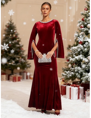 Noël Femmes Robe maxi Robe Trompette Sirène Robe trapèze Élégant Soirée Perlé Couleur Unie manche longue Col ras du cou Vin