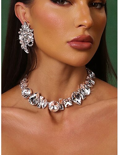 Ensemble collier et boucles d'oreilles en cristal argenté pour femme - bijoux glamour ornés de strass pour les fêtes, les mariages et les soirées.