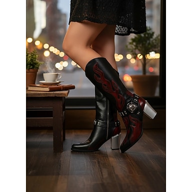 Bottes de cowboy western brodées de flammes pour femmes - Bottes gothiques mi-mollet noires et marron à talons épais pour Halloween, festivals de musique et tenues de rodéo