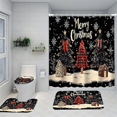 Ensemble de douche quatre pièces comprenant un rideau de douche, un siège de toilette antidérapant et robuste, un tapis de sol de salle de bain, le tout décoré d'un motif de sapin de Noël et du Père