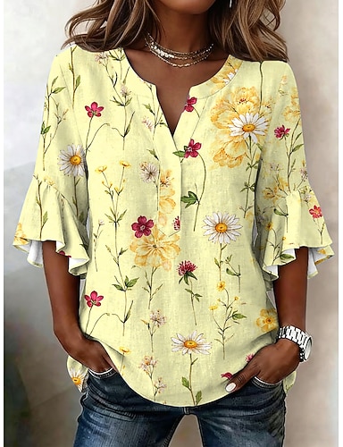 Femmes Chemisier A Volants Imprimé Fleuri Graphique Vacances Quotidien Rétro Vintage Manche 3/4 Col en V Hauts Réguliers Occasionnel Quotidien Fête Bleu Jaune Rose Claire Violet Été Printemps