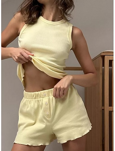 Femmes Ensemble Pyjama Occasionnel Confort Couleur Unie Taille Élastique Shorts Quotidien Maison Sans manches Col ras du cou Bleu Jaune Rose Claire Été Printemps Coupe régulière