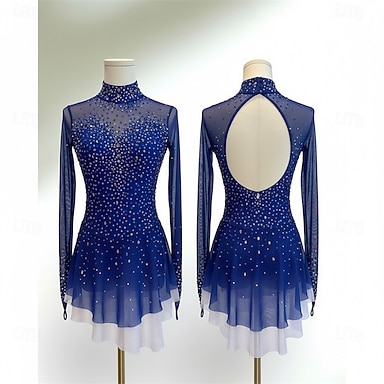 Robe de patinage artistique Femmes Patinage Robe Bleu Patchwork Dos Nu Haute Élasticité Entraînement Compétition Tenue de Patinage Classique cristal pailleté manche longue Patinage sur glace Patinage