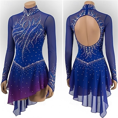 Robe de patinage artistique Femmes Patinage Robe Bleu Patchwork Dos Nu Haute Élasticité Entraînement Compétition Tenue de Patinage Classique cristal pailleté manche longue Patinage sur glace Patinage