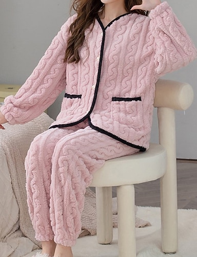 Femmes Pyjamas Loungewear Flanelle Mode Simple Couleur Unie Patchwork Pantalon Vacances Maison Lit manche longue Revers Rose Claire Rouge Bleu Violet Gris Automne Hiver Coupe sur mesure Coupe Ample