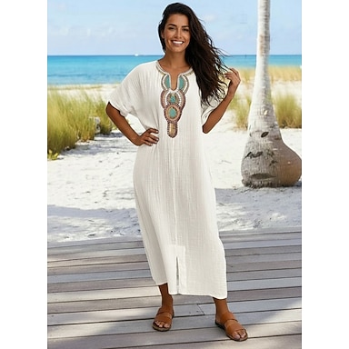 Robe longue femme en faux coton et lin, robe blanche décontractée, robe basique pour le quotidien, les sorties et les vacances, coupe classique, manches courtes géométriques, col en V, bleu, blanc, jaune, rose