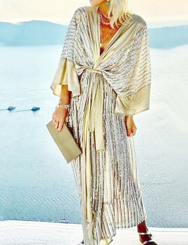 Femmes Robe Longue Maxi Robe Robes à paillettes Robe de Bal Robe de Soirée Élégant Moderne Soirée Occasion Spéciale Coupe Ample Bloc de Couleur manche longue Col en V Jaune clair Printemps Automne