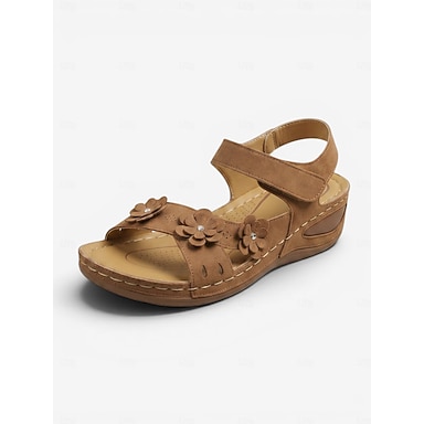 Sandales compensées marron à fleurs pour femme - semelle intérieure rembourrée et moelleuse, chaussures confortables et respirantes à bout ouvert, style bohème décontracté, idéales pour la marche, les