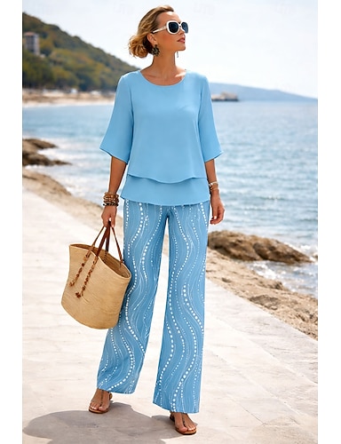 Femmes Ensembles de Pantalons Demi Manches Papillon Col rond Graphique Géométrique Élégant Vacances Occasionnel Quotidien Plage Bleu Rose Claire Violet Printemps & Été Coupe Ample