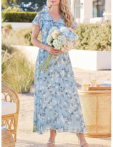 Femmes Robe maxi Robe en Chiffon Robe Fleurie Élégant Mode Moderne Quotidien Vacances Week-end Coupe régulière Fleuri Manche Courte Col en V Bleu Vert Bleu clair Été Printemps