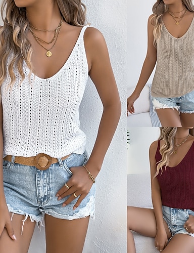 Femmes Pull Occasionnel Doux Couleur Unie Côtelé Col en V Tricoté Trou Sans manches Hauts Réguliers Tricoter Quotidien Extérieur Week-end Blanche Vin Été