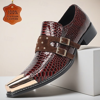 Chaussures habillées pour homme en cuir véritable bordeaux imitation serpent, élégantes chaussures à double boucle pour les mariages, chaussures de luxe pour le marié et les invités.