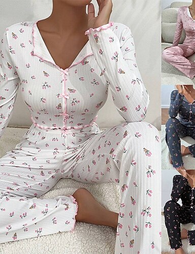 Femmes Ensemble Pyjama Occasionnel Confort Fleuri Taille Élastique Pantalon Maison Quotidien manche longue Col en V Bleu Noir Blanche Rose Claire Printemps Automne Coupe régulière