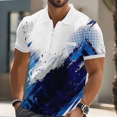 Homme Bloc de Couleur Géométrique Polo à fermeture éclair Manche Courte Col montant Affaires Sportif Loisir Affaires Athleisure Décontracté Quotidien Fermeture éclair Impression 3D Été Bleu Clair