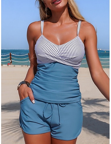 Femmes Maillots de Bain Tankini 2 pièces Shorts Maillot de bain Contrôle du ventre Taille haute Mince Dos nu Vacances Tenues de plage Rayure Col en V Sans manches Maillots de bain