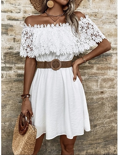 Femmes Mini Robe Robe en Dentelle Robe Blanche Élégant Mode Moderne Extérieur Plage Vacances Coupe régulière Uni Manche Courte Épaules Dénudées Noir Blanche Été Printemps