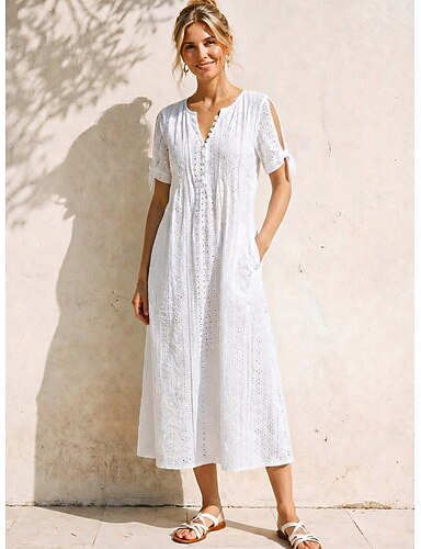 Femmes Robe Midi Robe Blanche Robe à œillets Mode Moderne Plage Vacances Fête Coupe régulière Fleuri Manche Courte Col en V Bleu Noir Blanche Vert Claire Été Printemps