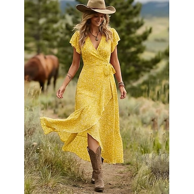 Femmes Robe Midi Robe Décontractée Robe Portefeuille Robe Fleurie Élégant Mode Moderne Extérieur Vacances Sortir Coupe régulière Fleuri Manche Courte Col en V Noir Jaune Chameau Violet Été Printemps