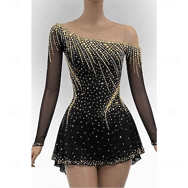 Robe de patinage artistique Femmes Patinage Robe Noir Patchwork Ourlet asymétrique Élastique Entraînement Compétition Tenue de Patinage Classique cristal pailleté manche longue Patinage sur glace