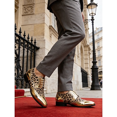 Chaussures habillées pour homme à imprimé léopard doré – un design audacieux et tendance pour les événements formels, les célébrations et les mariages.