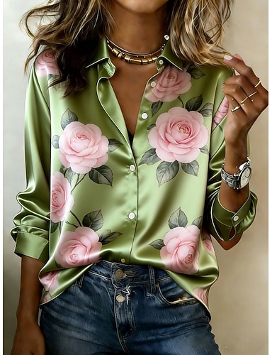 Femmes Chemise Chemise en satin Imprimé Fleuri Vacances Mode Quotidien manche longue Col de chemise Hauts Réguliers Quotidien Fête Sortir Vert Été Printemps Automne