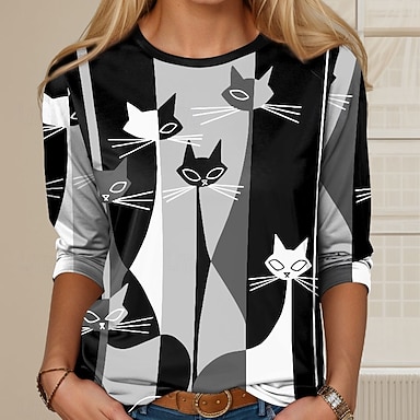 t-shirt femme décontracté bloc de couleurs imprimé chat manches courtes hauts réguliers col en V quotidien kaki été