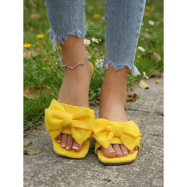 Sandales plates à nœud jaune pour femme – des mules légères et faciles à enfiler, un style estival décontracté et mignon, parfaites pour la plage, les vacances, la maison et le shopping.