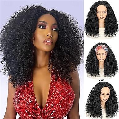 Perruque synthétique bouclée de 50 cm (20 pouces), avec cordon de serrage et bandeau, pour femme, couleur noire naturelle et agréable au toucher.