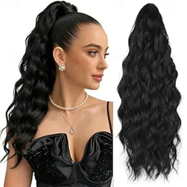 Extension de queue de cheval à pince, longue, ondulée et bouclée, 45 cm, en fibre synthétique, effet naturel et duveteux.