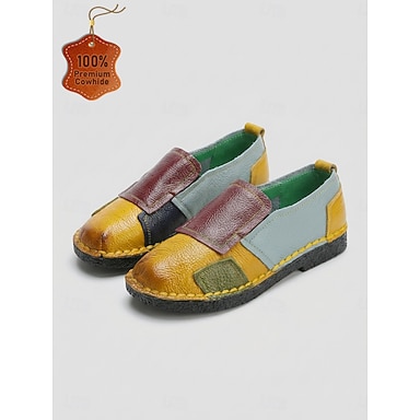 Ballerines bicolores jaunes en cuir de vachette véritable pour femme, cousues main, confortables et à semelle souple, idéales au quotidien, en voyage ou en vacances. &sorties décontractées
